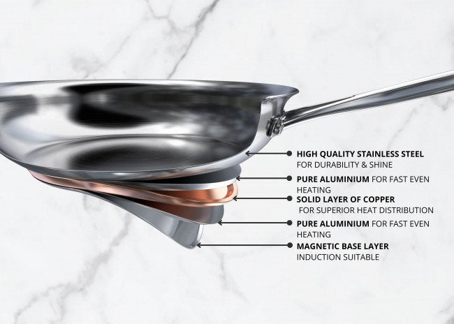A sheet of solid copper spreads heat rapidly across the base and around the corners of each pan, and heavyweight aluminium discs permanently sealed in stainless steel disperse and retain heat to eliminate hot spots. The result: optimum heat control and induction suitability.