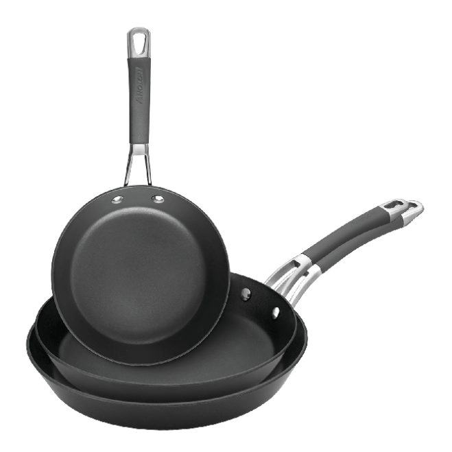 The sloped sides of a skillet lets food slide out easily, and the non-stick surface makes clean-up effortless. Use the larger pan for your family weekday meals or for weekend entertaining. Use the smaller skillet for a tasty BLT or to make nutty browned butter to top your seared tuna fillet.