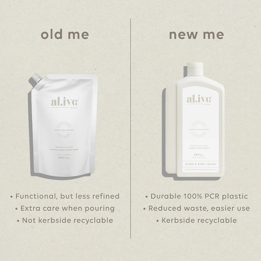 Each refill is designed to refill the 500ml al.ive body Hand & Body Wash bottle twice. With a controlled-flow spout for mess-free pouring, compact shape for easy storage, and full kerbside recyclability.