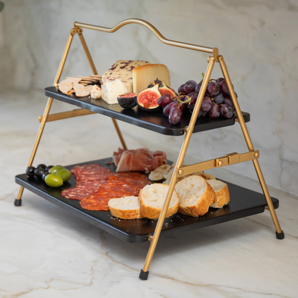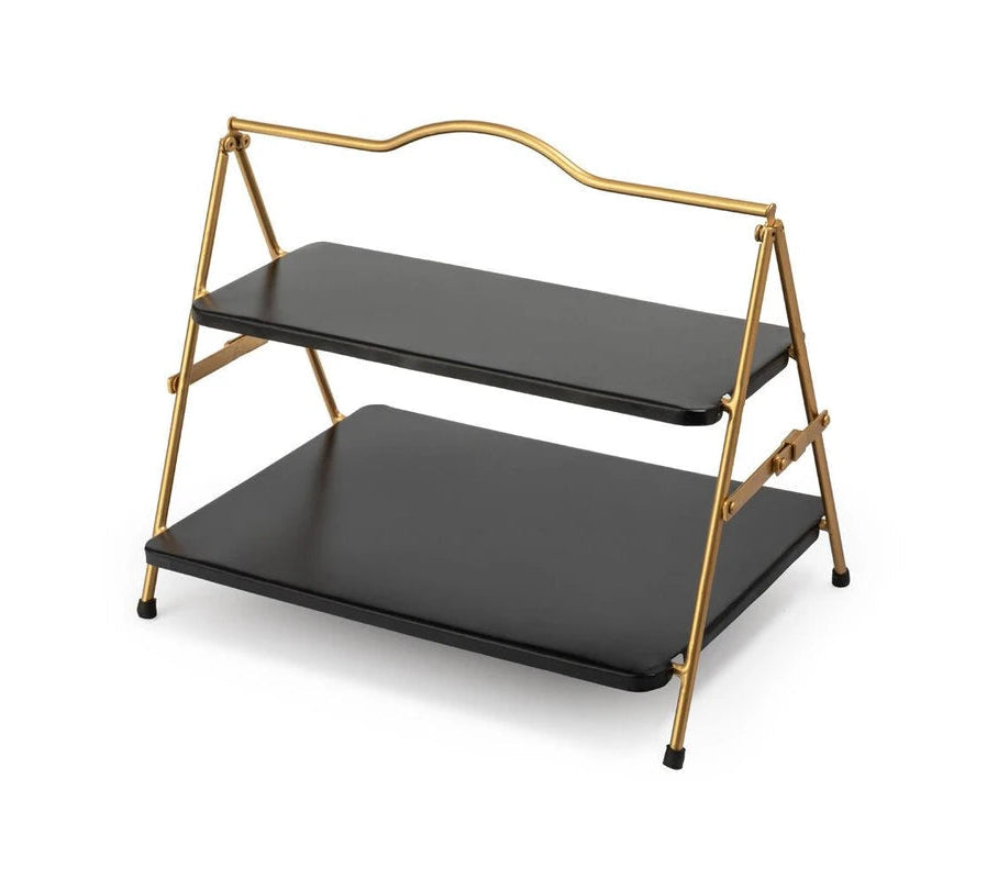 Elevate your entertaining with this sophisticated two-tier serving stand, designed to impress at any gathering. Featuring an elegant gold metal frame paired with sturdy black metal shelves, it provides the perfect platform for displaying cupcakes, canapés, pastries, or afternoon tea selections. The food-safe shelves are fully removable for effortless cleaning, whilst the ingenious folding design collapses flat for convenient storage when not in use. Measuring 39.3 x 26 x 34.5cm, this versatile piece transitions seamlessly from intimate dinner parties to grand buffets. An exceptional choice for the discerning entertainer or a thoughtful gift for those who appreciate quality tableware.