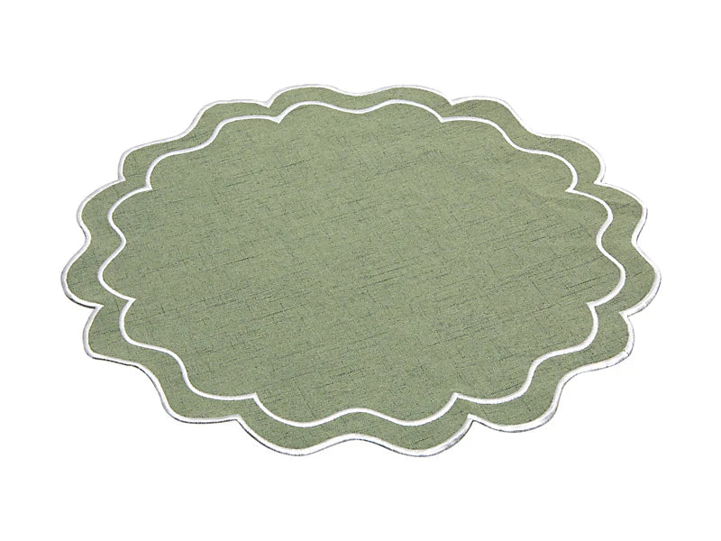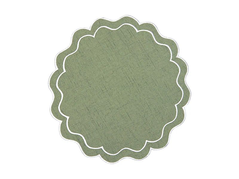 Bring Mediterranean charm to your table with the Casa Domani Banda Scallop Placemat in Green. Crafted from a premium linen and cotton blend using yarn-dye techniques, this 38cm placemat showcases elegant scalloped edges finished with contrasting white embroidery stitching. The refined design captures the essence of coastal dining traditions while offering practical versatility. Seamlessly coordinate with other Casa Domani collections to create a cohesive, curated tablescape that reflects timeless European sophistication and artisanal craftsmanship.