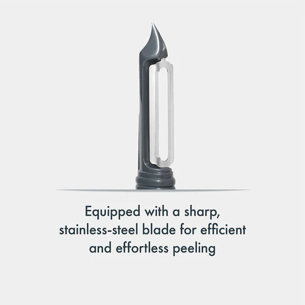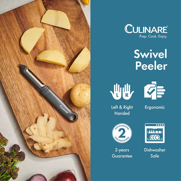 The Culinare Swivel Peeler in grey combines precision and efficiency for effortless peeling. Equipped with a sharp stainless-steel blade, it easily handles a variety of fruits and vegetables. Its smooth swivel action adapts to contours for consistent results, while the integrated blemish remover helps eliminate imperfections quickly, making it an essential tool for any kitchen professional.