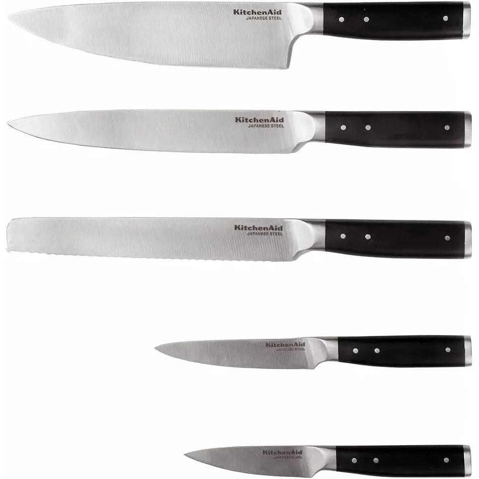 The KitchenAid Gourmet range include all the essential knives needed to perform everyday food prep tasks, such as slicing, cutting, chopping, trimming and more. Each forged blade is expertly crafted using high-carbon Japanese steel for a professional, quality cut every time. Constructed for perfect stability and control, the handles are well-balanced and feature a triple-riveted construction for a secure, comfortable grip.