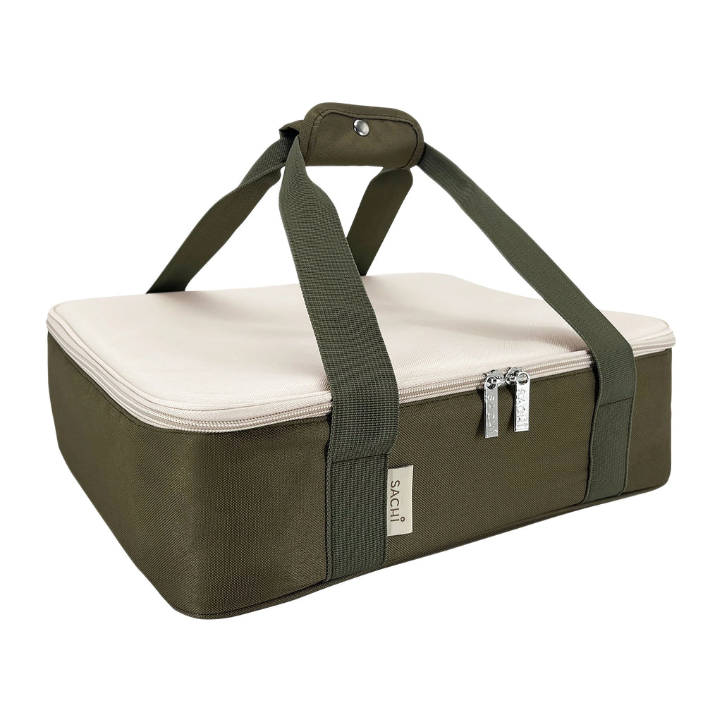 Transport your culinary creations with confidence using the Sachi Insulated 'Cook & Carry' Bag XL in Olive Green. This expertly engineered insulated carrier accommodates large casserole dishes, lasagne trays, and serving platters with its spacious rectangular design. Premium insulation technology maintains optimal food temperatures throughout transport, whether you're heading to family gatherings, picnics, or outdoor entertaining. The robust construction features durable fabric, reinforced metal hardware, and padded snap-closure handles that ensure secure, comfortable carrying. Dual-zip opening provides convenient access to your dishes, making this an indispensable companion for anyone who regularly transports prepared meals.