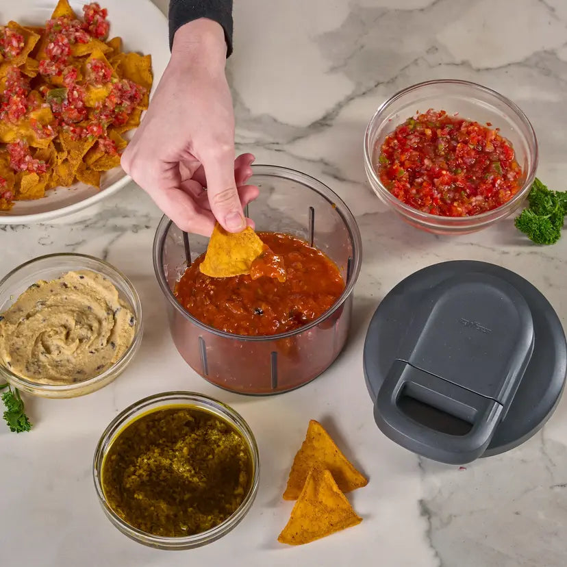 Chops, mixes, and blends with a simple pull — no plugs or batteries needed. 3–5 pulls for a coarse chop, 8–10 for finer results