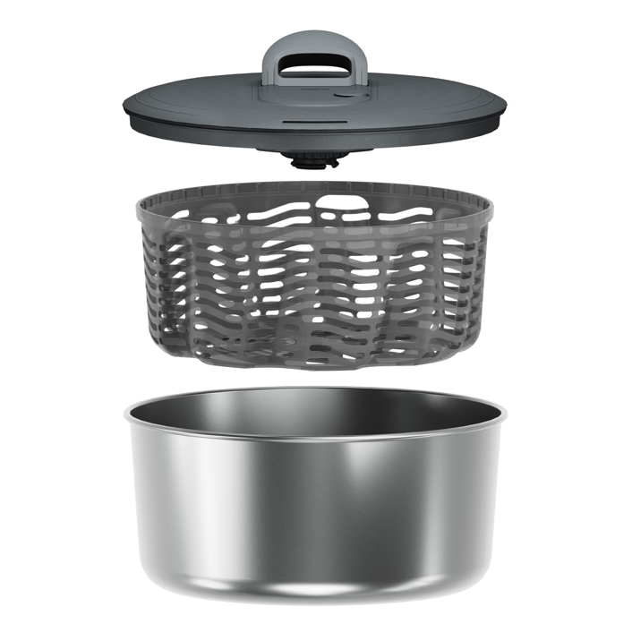 Retractable cord, brake system and patented AquaVent™ technology for fast, efficient water extrusion. Dries 2-4 portions of salad or vegetables.